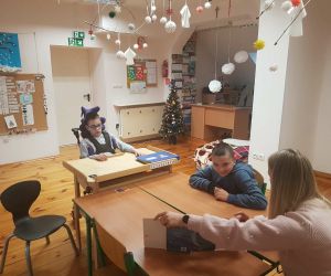 Młodzież z dwóch grup z zainteresowaniem obejrzała również teatrzyk Kamishibai pt. „Wypożyczalnia skrzydeł” oraz chętnie odgadywała zagadki o bałwankach przygotowane przez bibliotekarkę.