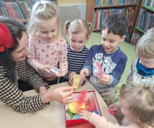 Dnia 10 marca Filia nr 1 miała przyjemność gościć dzieci z Przedszkola Niepublicznego Mali Odkrywcy. Bibliotekarka, p. Monika, przeczytała dzieciom wiersz autorstwa Agnieszki Glinko pt.” Ciotka Klotka”. Maluchy słuchały wiersza z ogromnym zainteresowaniem, a przygotowane przez bibliotekarkę rekwizyty były doskonałym dopełnieniem głośnego czytania. Dzieci nie tylko słuchały, ale również aktywnie uczestniczyły w zabawie. Przedszkolaki miały możliwość testowania przyborów na gilgotki z „Sekretnego pudełka Ciotki Klotki”.