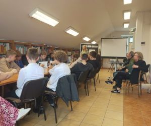 Na początku spotkania Dyrektor Biblioteki Monika Mazurkiewicz przywitała młodzież, która przybyła wraz z wychowawczynią Aliną Kłyzą oraz przedstawiła wyjątkowego gościa- pana Pawła Matraszka - Synagoga Chewra Nosim przy ulicy Lubartowskiej 10 w Lublinie.