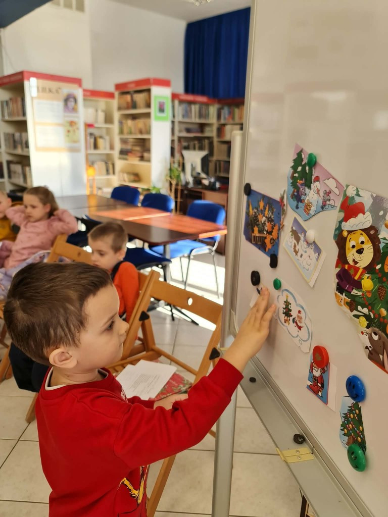W dniu 21 stycznia bibliotekę odwiedziły dzieci z Przedszkola Publicznego nr 1 z grupy „Krasnoludki”. Przedszkolaki opowiedziały dlaczego lubią zimę, co im się kojarzy z tą porą roku i jakie zabawy zimowe lubią najbardziej. W dalszej części zajęć dzieci pokazywały jak „zachowuje się” zmarznięty bałwan, wesoły narciarz, jak się jeździ na nartach lub lepi bałwana. Zadaniem przedszkolaków było też wybranie ilustracji, które kojarzą się z zimą i umieszczenie na tablicy. Następnie bibliotekarka zaprezentowała „Krasnoludkom” książeczki o tematyce zimowej. Z okazji dzisiejszego Święta Babci i jutrzejszego Dnia Dziadka, nie zabrakło też rozmów na temat tego, jak dzieci obchodzą te wyjątkowe dni z dziadkami. Bibliotekarka przeczytała fragment rozdziału z książeczki Renaty Piątkowskiej pt. „Dziadek na huśtawce” zachęcając tym samym dzieci, aby wspólnie z dziadkami odwiedzały bibliotekę i wypożyczały książki.