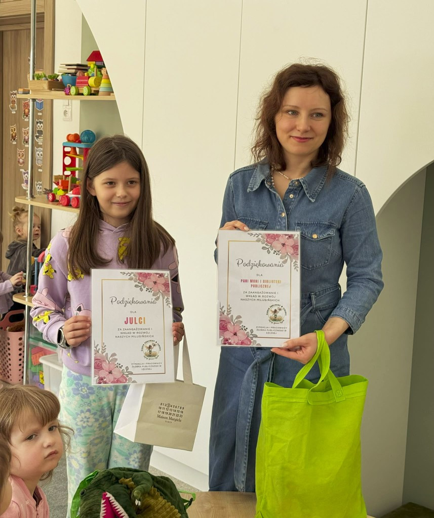 W ramach obchodów Dnia Dinozaura bibliotekarka z Filii nr 1 wraz z gościem specjalnym –miłośniczką książek Julcią - odwiedziła Żłobek Publiczny w Łęcznej. Dzieci wysłuchały głośnego czytania książki pt. „Dinozaury” i wraz z jej głównym bohaterem Samochodzikiem Frankiem odkrywały fascynujący świat prehistorycznych stworzeń. W dalszej części spotkania przyszedł czas na zabawę T- Rexem i bliższe poznanie tych pradawnych gadów. Maluchy oglądały książeczki z ruchomymi elementami i okienkami, za którymi skrywały się kolejne „dinozaurowe” ciekawostki. Dziękujemy za ciepłe przyjęcie naszego duetu i wspólny czas pełen uśmiechów, książek i oczywiście DINOZAURÓW!