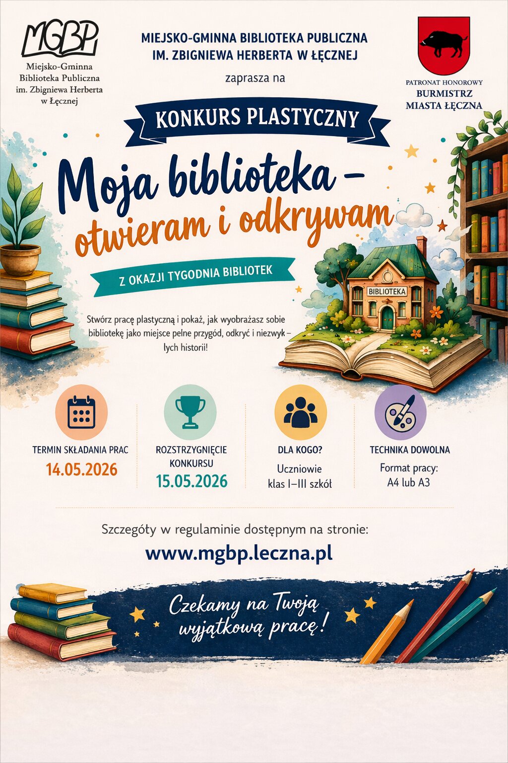 Miejsko-Gminna Biblioteka Publiczna im. Zbigniewa Herberta w Łęcznej zaprasza uczniów klas I–III do udziału w konkursie plastycznym „Moja biblioteka – otwieram i odkrywam”.
