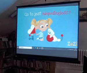 Dzieci odpowiadały na zadawane przez bibliotekarkę pytania dotyczące tematyki zajęć oraz wysłuchały piosenek: „Piosenka młodego patrioty”, "Jesteśmy Polką i Polakiem" oraz „Co to jest niepodległość”.