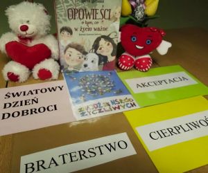 Spotkanie zostało oparte o opowiadanie dla dzieci „Historia o życzliwości. Zdjęcie z półki z książkami” Marka Michalaka, pochodzące ze zbioru „Opowieści o tym, co w życiu ważne” tegoż autora. Uczniowie klas O b, O d oraz O e ze Szkoły Podstawowej nr 4 wysłuchali opowiadania o jednej z bohaterek II wojny światowej – Irenie Sendlerowej. Ryzykując własnym życiem pomagała dzieciom z getta w Warszawie. Uratowała dwa i pół tysiąca dzieci. Uczniowie obejrzeli prezentację multimedialną „Co to jest dobroć?” oraz wysłuchali piosenek o pomaganiu oraz o szacunku do innych. Uczniowie chętnie wzięli udział w dyskusji dydaktycznej na tematy: „Jak każdy z Was może pomagać innym?” oraz „W czym ja potrzebuję pomocy”? Na zakończenie zajęć dzieci otrzymały karteczki z cytatami na temat dobroci oraz wysłuchały piosenki „Uśmiechnij się”. Dziękujemy za obecność i wspólne świętowanie Dnia Dobroci.