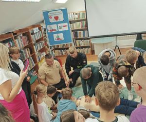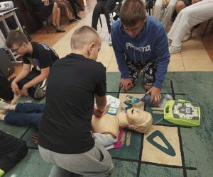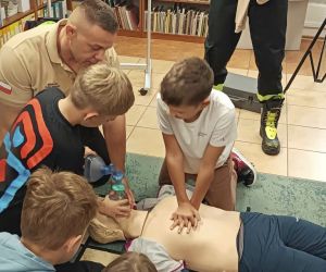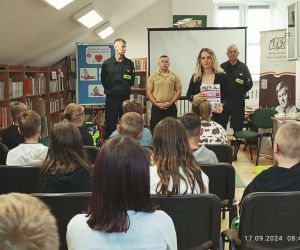 Do Biblioteki zaprosiliśmy zastęp strażaków z Komendy Powiatowej Państwowej Straży Pożarnej w Łęcznej w składzie: Pan Marcin Duklewski, Pan Wojciech Wojtaszek, Pan Michał Muzyka, którzy podzielili się swoją wiedzą z uczniami. Dzięki tej wizycie młodzi ludzie przypomnieli sobie zasady pierwszej pomocy przedmedycznej, mieli również okazję niektóre elementy przećwiczyć w praktyce. Strażacy opowiedzieli w jaki sposób zachować się w sytuacji gdy ktoś potrzebuje pomocy zanim przyjadą służby, zapraszali do udziału w ćwiczeniach praktycznych oraz odpowiadali na pytania.