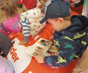 W trakcie spotkania dzieci miały możliwość zobaczenia wiele różnorodnych książek. Ogromną ciekawość wzbudziła magiczna skrzynka, czyli teatrzyk Kamishibai i bajka pt. " Kotka Psotka".