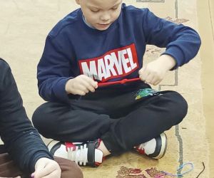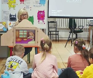Na dzisiejszych zajęciach był czas na wspólne zabawy, oglądanie bajki pt. "Złotowłosa i trzy misie" z wykorzystaniem Teatrzyku Kamishibai i nazywanie występujących w bajce emocji.