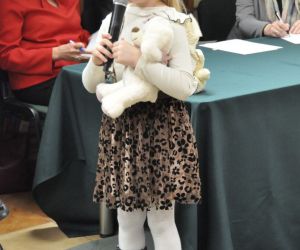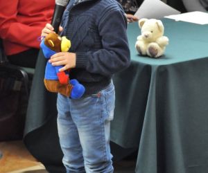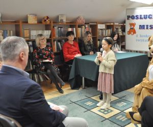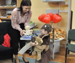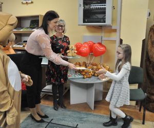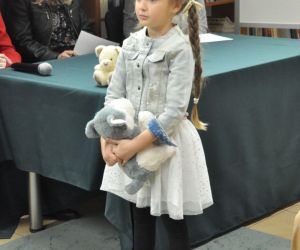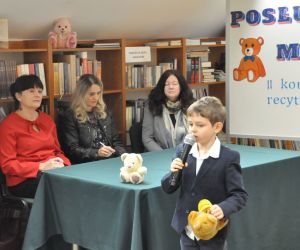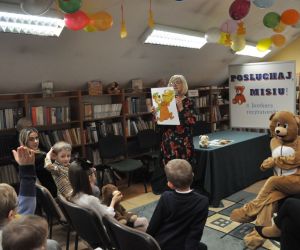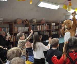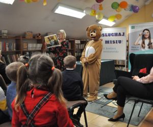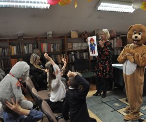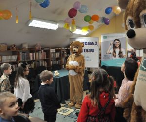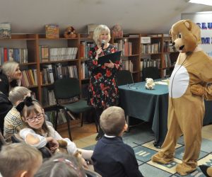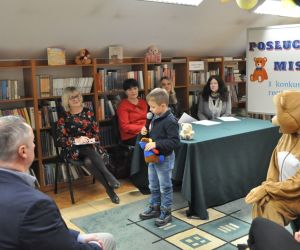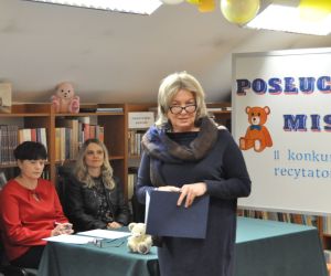 Na początku spotkania Dyrektor Biblioteki Monika Mazurkiewicz przywitała (wspólnie z pluszowym misiem), Wszystkich przybyłych na spotkanie. W postać pluszowego misia wcieliła się pani Anita Rządkowska. Nasz biblioteczny pluszowy miś witał Wszystkich, przysłuchiwał się recytacjom, brał udział w misiowych zabawach jak również pozował do zdjęć i częstował cukierkami.