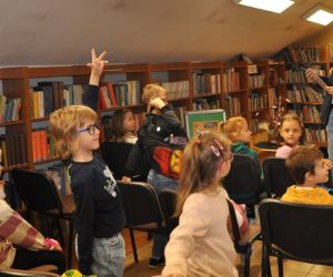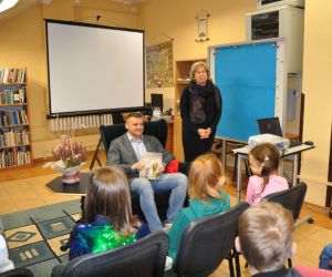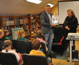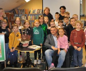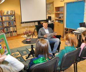 Pan Grzegorz z wielką przyjemnością przyjął zaproszenie na spotkanie i przeczytał dzieciom książkę pt. „Kiedy tata Oli był mały". Dzieci z ogromnym zainteresowaniem słuchały uroczej opowieści, w której tata Oli wraca wspomnieniami do czasów ze swojego dzieciństwa. Podczas czytania było dużo śmiechu, bo jak nie śmiać się słuchając: - "Kiedy ja byłem mały, kładliśmy się spać godzinę po powrocie ze szkoły", albo - "Ach, bo kolacja była tylko w środy. W pozostałe dni nic nie jedliśmy".