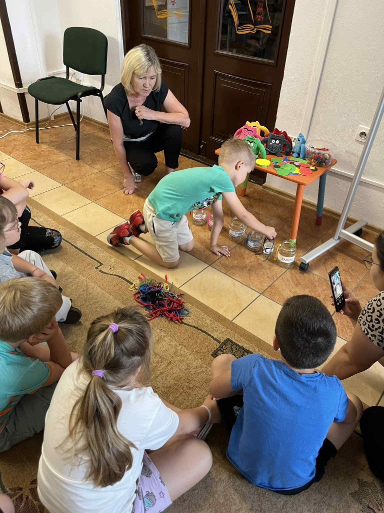 W kolejnej części zajęć dzieci pomagały Kolorowemu Potworowi uporządkować poplątane nitki emocji – rozwikłane kolorowe włóczki trafiały do odpowiednich słoiczków. Każde dziecko miało okazję opowiedzieć, z czym kojarzy mu się dana emocja i kiedy ją odczuwa. Następnie dzieci obejrzały film edukacyjny „Emocje”, z którego dowiedziały się, jak można radzić sobie z różnymi uczuciami zarówno tymi przyjemnymi, jak i trudniejszymi.