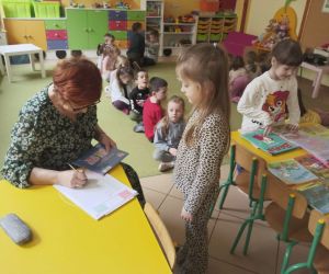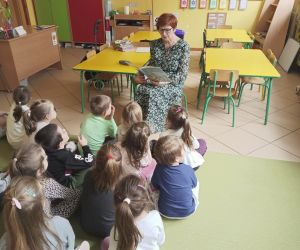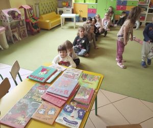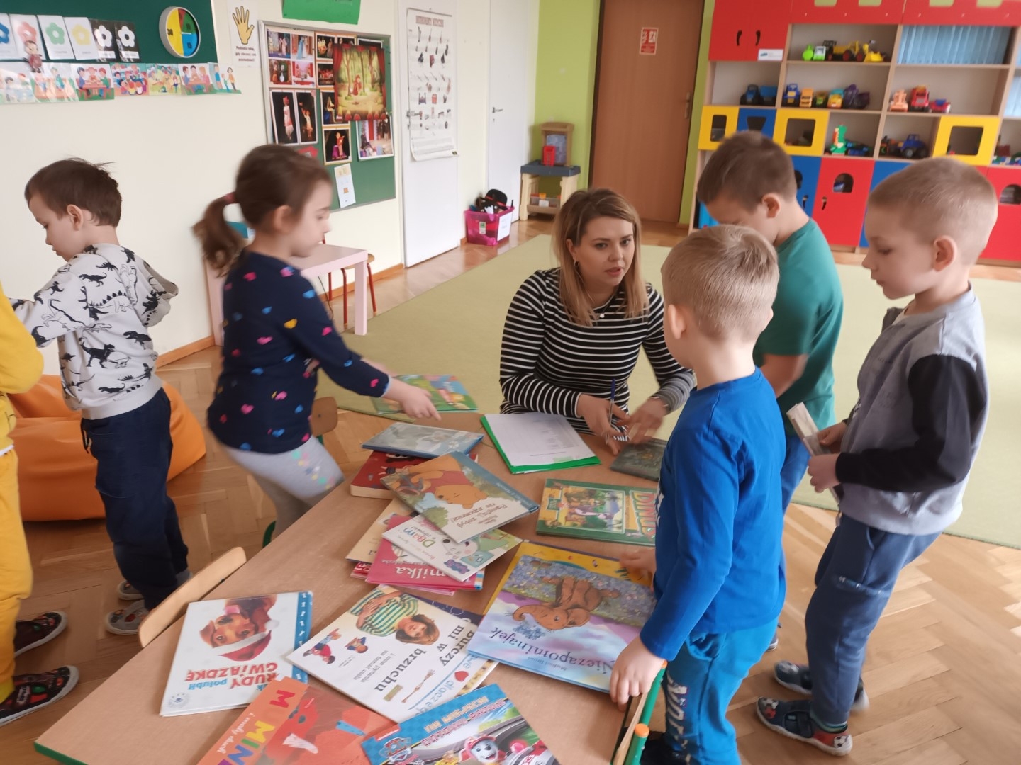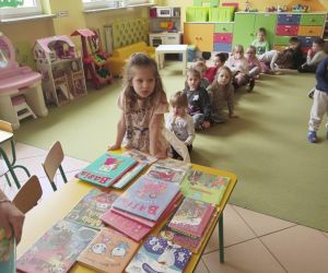 Podczas spotkania, w ramach akcji „Koszyk z książkami” dzieci z grupy „Biedronki” wysłuchały wiersza Kaliny Rokosz pt. „Wierszyk o teatrze-Magiczne miejsce” oraz opowiadania Urszuli Piotrowskiej „Idziemy do teatru”. Przedszkolaki chętnie wymieniły się swoimi spostrzeżeniami z ostatniej wycieczki do teatru. Na zakończenie wizyty, dzieci wypożyczyły książki.