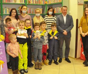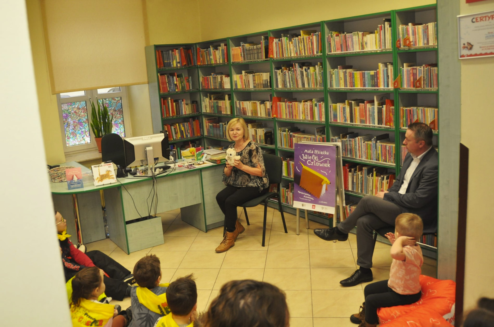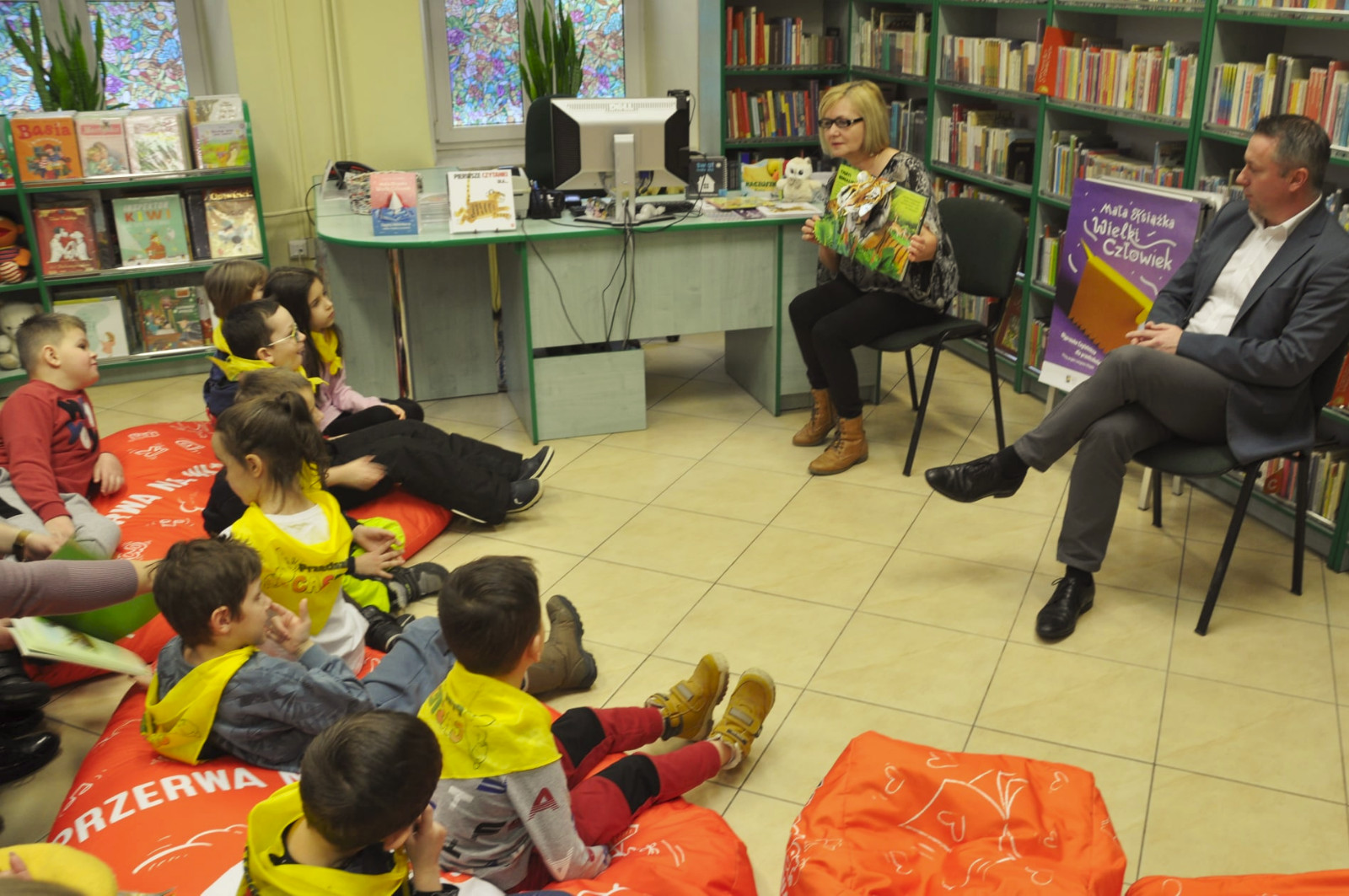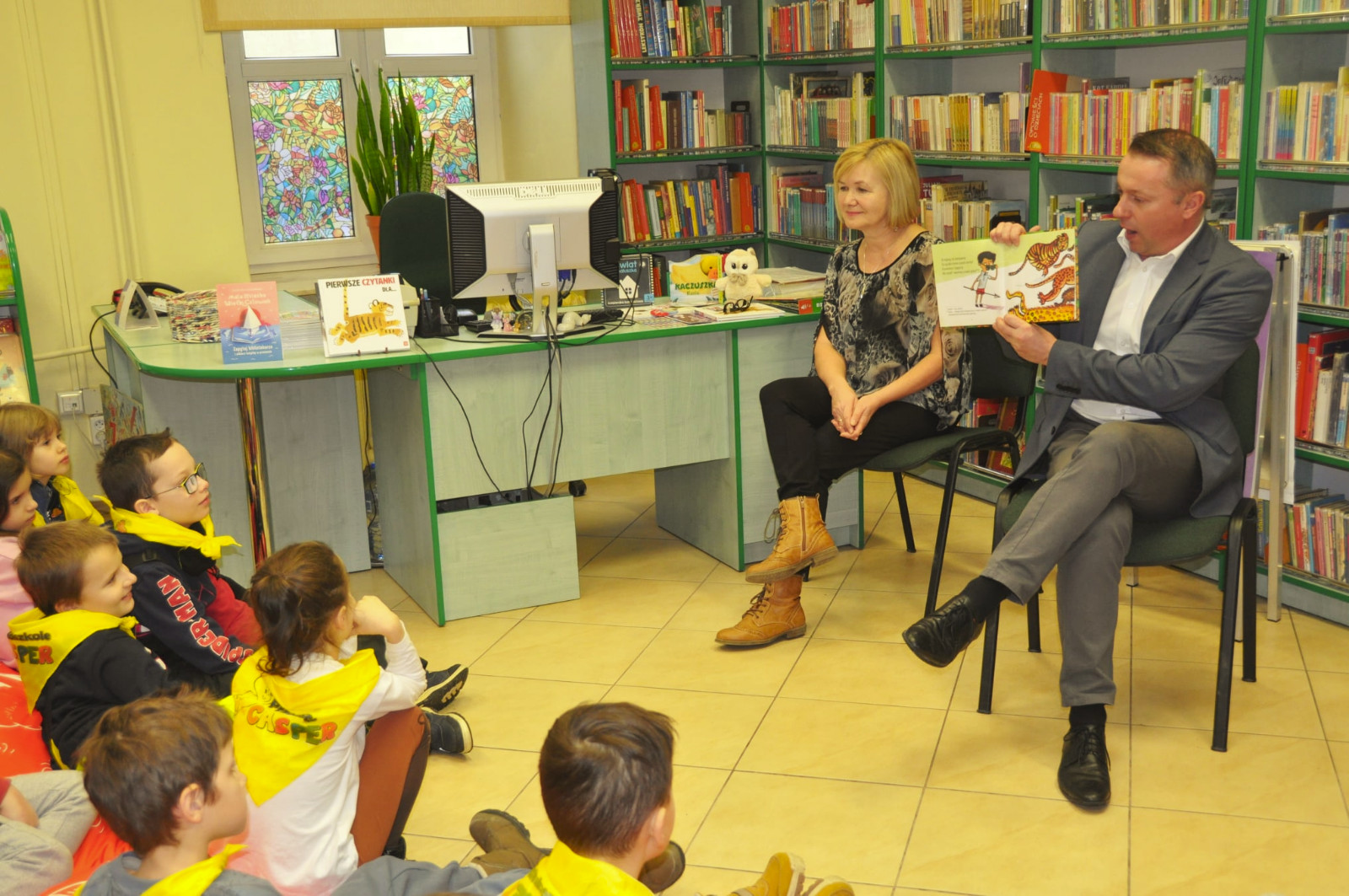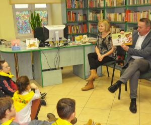Miłym akcentem spotkania przedszkolaków w bibliotece, była wizyta burmistrza Leszka Włodarskiego, który przeczytał książkę autorstwa Marii Konopnickiej pt. „Stefek Burczymucha”.