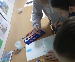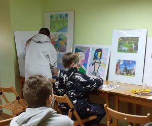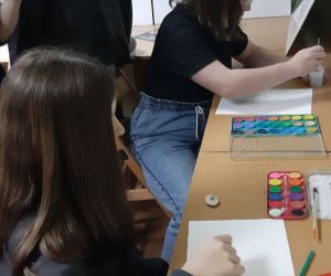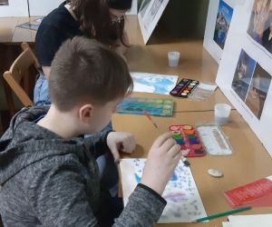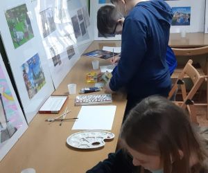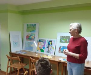 Następnie uczniowie zwiedzili autorską wystawę Majki Marii Zuzańskiej i wysłuchali jej ciekawego wykładu o malowaniu akwarelą. Malarka poprowadziła również dla nich warsztaty, na których uczniowie malowali prace w oparciu o różnorodne skojarzenia dla tego samego tematu, jakim był kubek z wiersza Konopnickiej. W ramach integracji i współpracy każda praca była malowana przez 4 osobowe grupy. W efekcie wspólnych działań powstało 6 prac malowanych akwarelą pt.: „Kubek”.