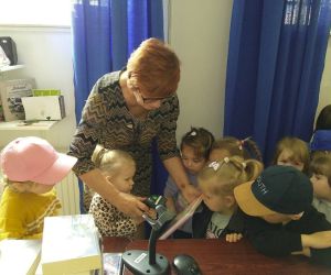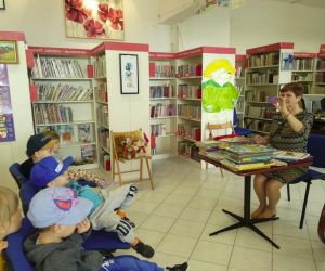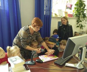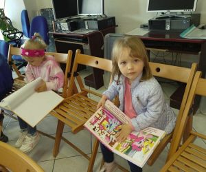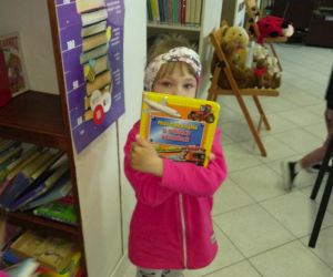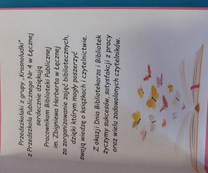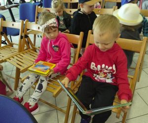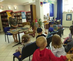 Bibliotekarka Krystyna Skoczylas przeczytała książkę Anity Głowińskiej pt.: „Kicia Kocia w bibliotece”. Dzieci dowiedziały się z niej co można robić w bibliotece poza wypożyczaniem książek, kim jest tajemnicza pani w kapeluszu i co to jest autograf. Z zainteresowaniem oglądały książki znajdujące się na półkach w dziale dla najmłodszych czytelników. Z okazji roku Marii Konopnickiej wysłuchały wiersza pt. : „Kukułeczka”, a następnie zobaczyły i doświadczyły jak wypożycza się książki. Na zakończenie miłej wizyty poczęstowały się cukierkami, a bibliotekarka otrzymała piękną laurkę z życzeniami z okazji Dnia Bibliotekarza i Bibliotek.