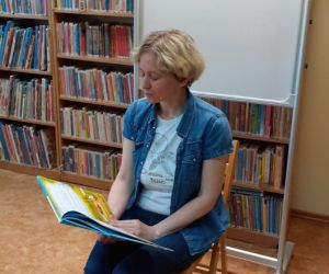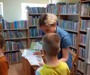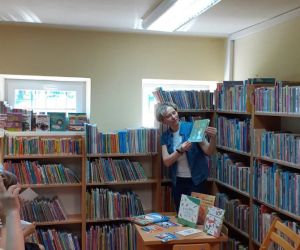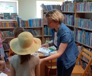 Prowadząca opowiedziała także uczestnikom o ciekawych lekturach na wakacje i zachęciła je do samodzielnego czytania. Następnie pokazała małym czytelnikom ciekawe książeczki i książki o różnej wielkości, tematyce i kształtach, aby każdy mógł znaleźć coś dla siebie.