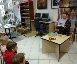 Krystyna Skoczylas objaśniła dzieciom, czym jest ojczyzna, jakie są nasze symbole narodowe oraz znaczenie barw. Przedszkolaki dowiedziały się także czym jest hymn i jaką należy przyjąć postawę podczas jego śpiewania. Wszystkie te informacje pochodzą z książki Janusza Puskarza pt. : „ABC małego patrioty”.