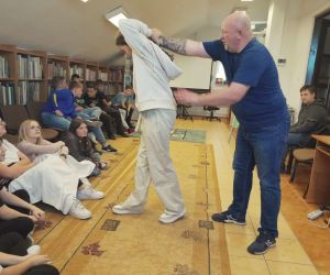 Młodzi ludzie mieli okazję wysłuchać pogadanki na temat bezpieczeństwa w szkole i w życiu codziennym oraz poznać techniki obrony przed kopnięciem, duszeniem oraz uderzeniem. Dodatkowo instruktor zaprezentował w jaki sposób obronić się przed atakiem osoby, która posiada niebezpieczne narzędzie np. nóż, jak uwolnić się z uchwytu oraz jak reagować w sytuacji bezpośredniego zagrożenia.