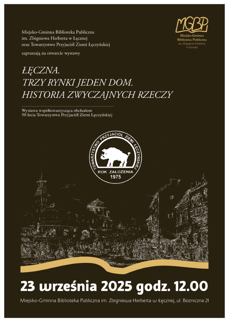 Miejsko-Gminna Biblioteka Publiczna im. Zbigniewa Herberta w Łęcznej oraz Towarzystwo Przyjaciół Ziemi Łęczyńskiej zapraszają na otwarcie wystawy „ŁĘCZNA.TRZY RYNKI- JEDEN DOM. HISTORIA ZWYCZAJNYCH RZECZY".