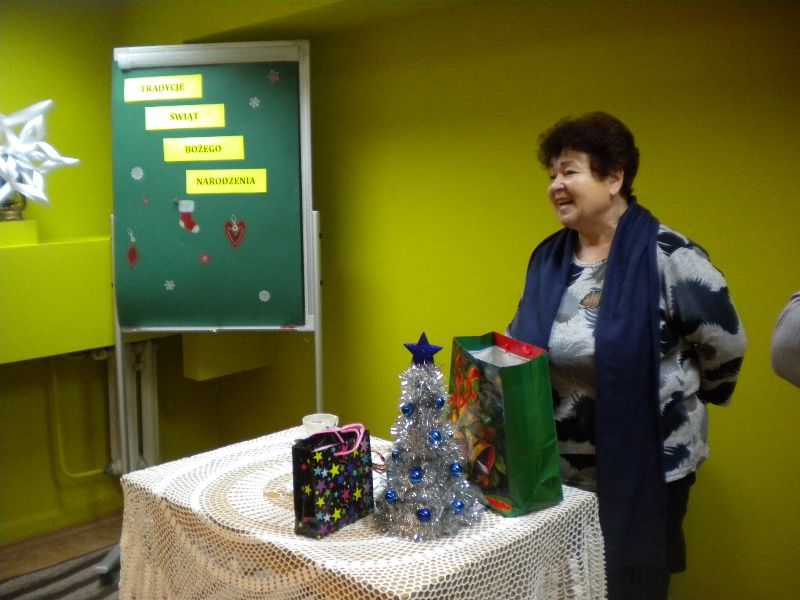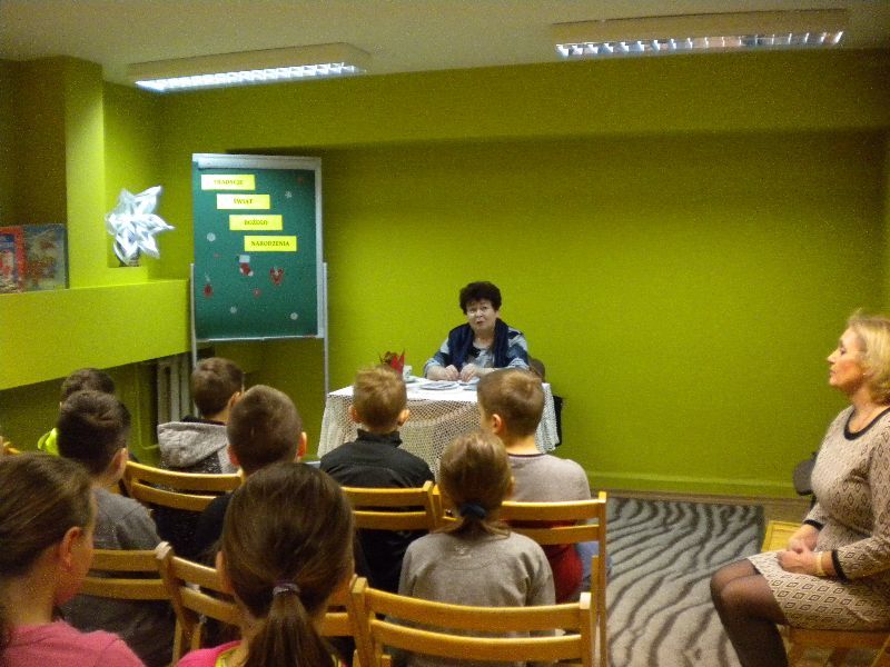W świąteczny nastrój wprowadziła nas Barbara Małek emerytowany pracownik byłego Muzeum Regionalnego w Łęcznej oraz Muzeum Lubelskiego w Lublinie. W bardzo interesujący sposób opowiadała o zwyczajach bożonarodzeniowych Lubelszczyzny. Mówiła o tradycjach wigilijnych, które są bardzo ważnym elementem naszego życia, i że należy je pielęgnować i przekazywać z pokolenia na pokolenie. Pani Barbara opowiadała dzieciom o przygotowaniach do obchodów wieczerzy wigilijnej, tradycji śpiewania kolęd, wystawianiu jasełek i zwyczaju budowania wigilijnych szopek. Rozmawiała z uczestnikami spotkania na temat obyczajów panujących w ich domach. Symbolika ozdób wieszanych na choince wzbudziła wielkie zainteresowanie wśród dzieci. Na koniec spotkania wspólnie zaśpiewaliśmy kolędę.