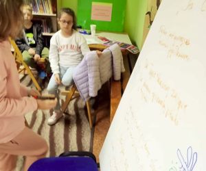 Na początku zajęć edukacyjnych uczniowie wysłuchali książki pt. „Wypożyczalnia skrzydeł” autorstwa Iwony Pietrzak-Płachty oraz malarki Matyldy Koneckiej, która wprowadziła w tematykę spotkania.