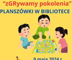 W dniu 9 maja 2024 r. odbyło się spotkanie sympatyków gier planszowych zorganizowane w Bibliotece przy ul. Bożnicznej 21 z okazji Ogólnopolskiego Tygodnia Bibliotek, który obchodzony jest pod hasłem: "Biblioteka -miejsce na czasie" Spotkanie poprowadzili członkowie klubu gier planszowych zGRAni - sąsiedzki klub gier planszowych w Łęcznej Dziękujemy Wszystkim za wspólnie spędzony czas.