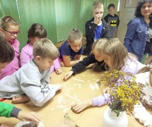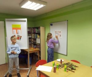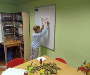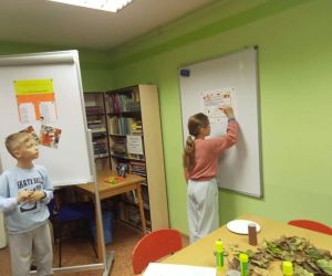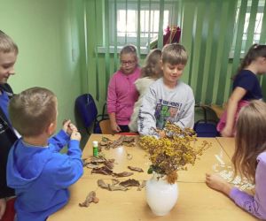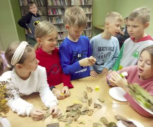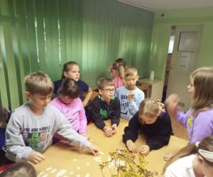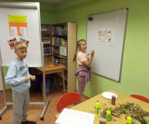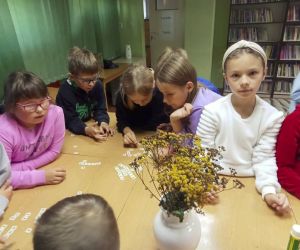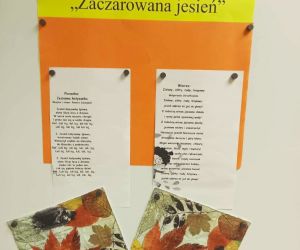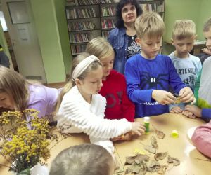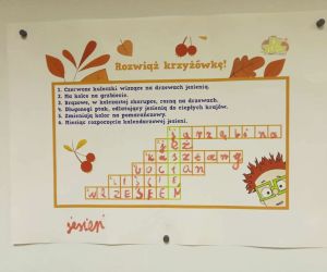 Następnie chętni uczestnicy rozwiązywali krzyżówki i zagadki poświęcone jesieni. „Grupy: Jeżyki i Liski – III c oraz Jeżyki i Wiewiórki - III e” dzielnie rywalizowały ze sobą w zgadywaniu jesiennych zagadek. W dalszej części uczestnicy poznali utwór muzyczny Antonio Vivaldiego pt.: „Jesień”. Chętni uczniowie wykazali się talentem twórczym i układali „jesienne hasła”- w grze „Remik Słowny” lub w grupie wykonywali „jesienne drzewko” z liści i papierowych talerzyków. Na zakończenie chętni mogli wypożyczyć książki.