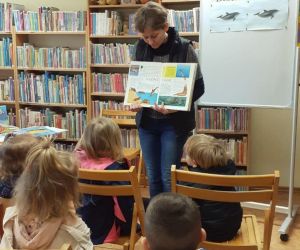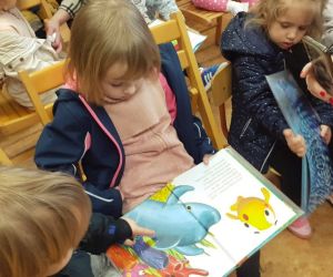 Podczas głośnego czytania nasi czytelnicy wysłuchali ciekawostek o delfinach oraz wierszy: „Delfiny” Marty Próchniewicz i „Ryba” Michała Jankowiaka. Następnie dzieci obejrzały różnorodne ciekawe książeczki ze zdjęciami i rysunkami delfinów oraz ryb morskich.